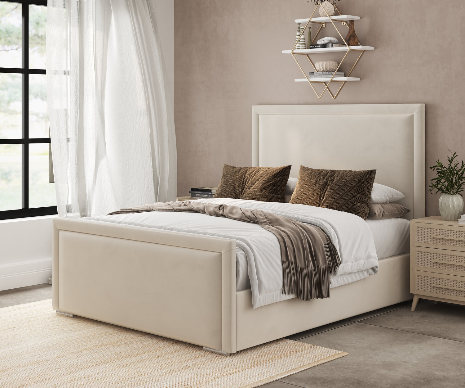 The Glitz Bed Frame embodies understated elegance with its sleek and minimalist design. The clean lines of the headboard and footboard, paired with a smooth, plush fabric finish, create a sophisticated yet inviting look. Its neutral cream shade adds a touch of warmth, making it a versatile choice that complements both classic and contemporary interiors. The high-quality upholstery enhances the luxurious feel, making it the perfect centerpiece for a stylish bedroom.