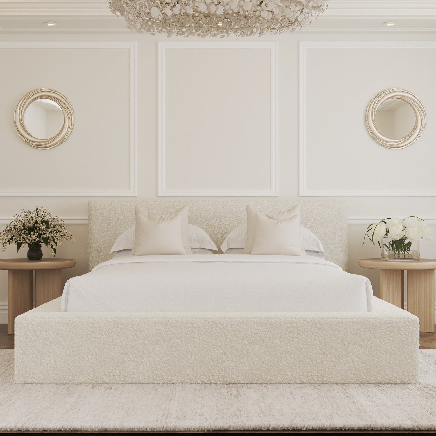 - Upholstered in premium cream bouclé