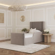 Elevate your bedroom with this luxuriously upholstered wingback bed, designed for both style and comfort. Featuring a deeply padded, vertical panelled headboard with elegant side wings and baseboards, this bed adds sophistication and a touch of drama to any space.