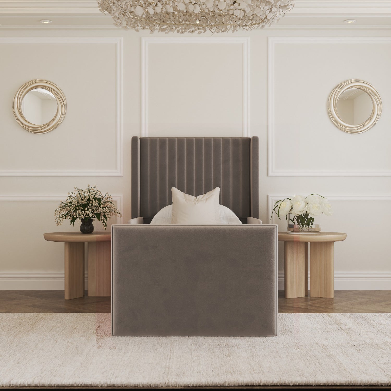 Wrapped in a soft, velvet-textured fabric and finished in a serene neutral tone, it pairs perfectly with both classic and contemporary interiors. The high footboard and smooth side rails create a cozy, cocoon-like feel — perfect for those who want their bed to be the main statement piece of the room.