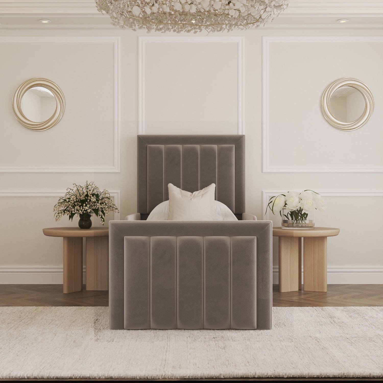 Upholstered in a rich, neutral-toned velvet-style fabric, the Snuggie is perfect for parents who want a timeless piece that grows with their child. The no-wing design keeps things minimal, while the built-in baseboard ensures durability and a flat sleeping surface. And with no gas lift, it’s safe, solid, and stress-free.
