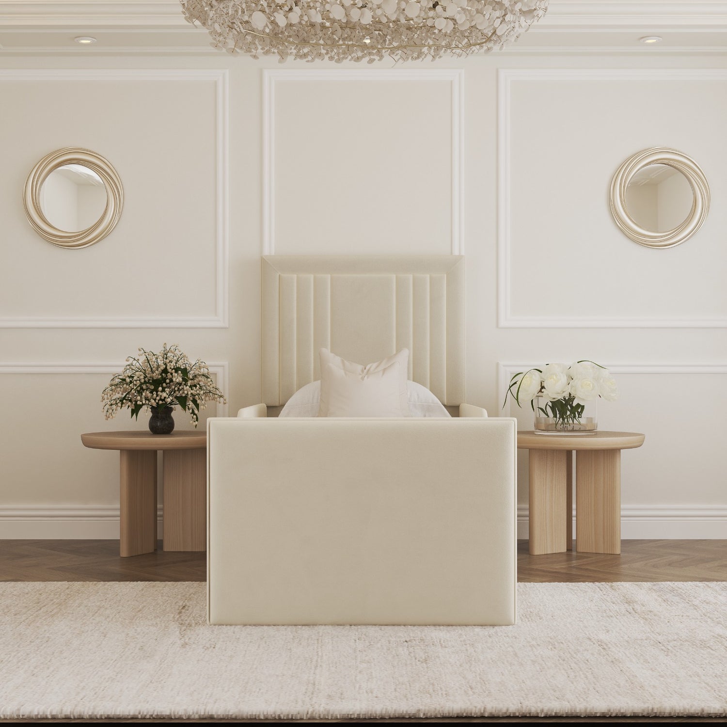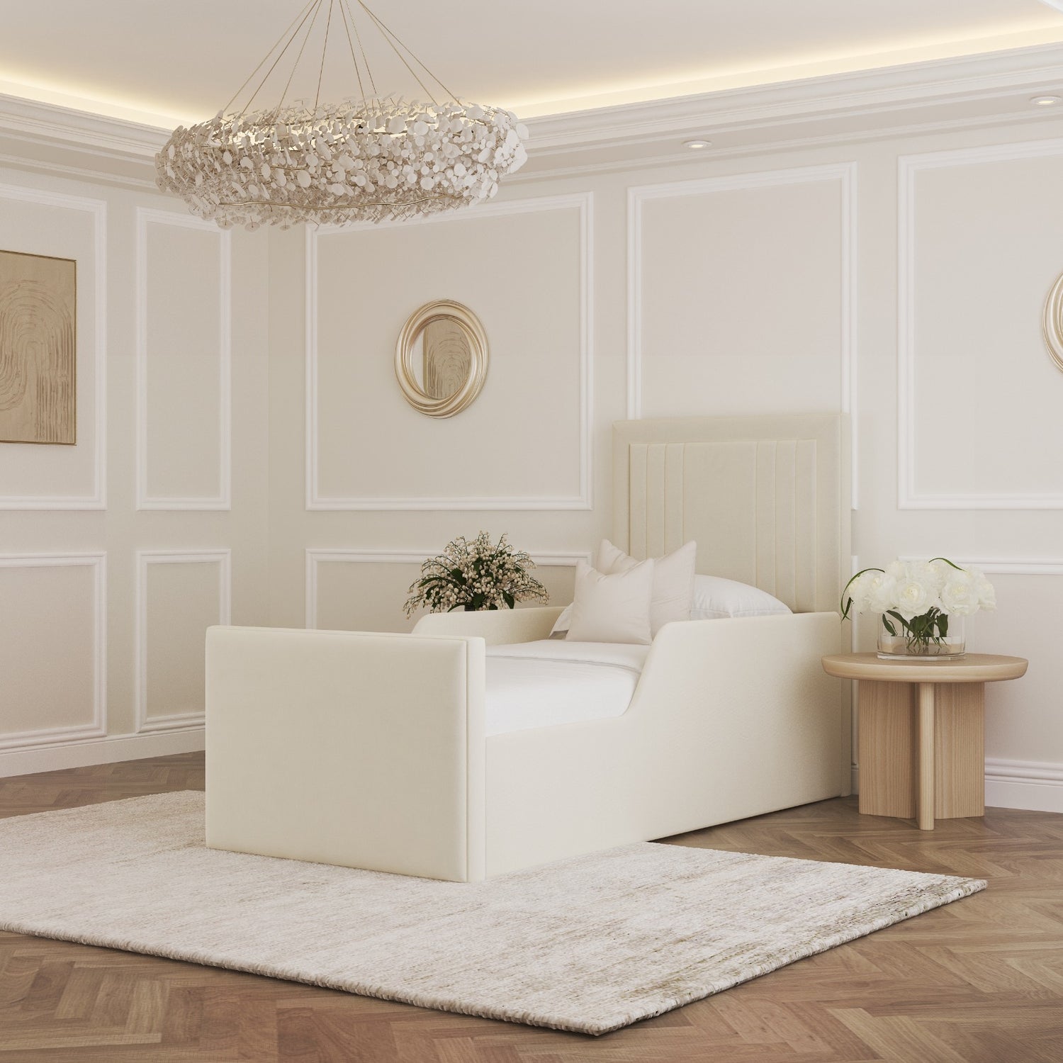 Create a peaceful haven for your little one with the Snugsy Kids Upholstered Bed – a minimalist masterpiece in soft cream velvet-style fabric. Designed with a streamlined vertical-panel headboard, this bed combines subtle design with functional comfort.