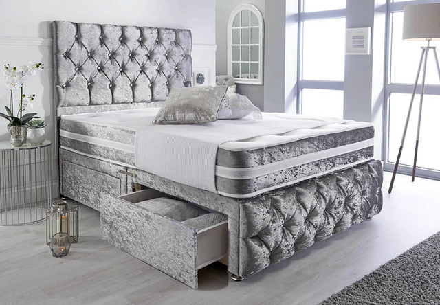 Queen Crushed Velvet Divan Bed Set With Headboard and Mattress Options